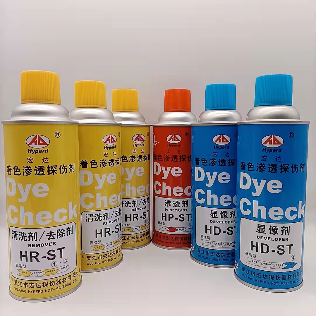 著色探傷的基本原理:用著色劑涂在材料的表面,著色劑滲入受損部位。放置一段時間后將表面的著色劑沖洗掉。在已經(jīng)清洗干凈的表面涂上顯影劑,損傷部位由于著色劑滲入其中從而看得一清二楚。主要利用毛細(xì)現(xiàn)象使?jié)B透液滲入缺陷,經(jīng)清洗劑清洗使表面滲透液清除,而缺陷中的滲透液殘留,再利用顯像劑的毛細(xì)管作用吸附出缺陷中殘留的滲透液而達(dá)到檢驗(yàn)缺陷的目的