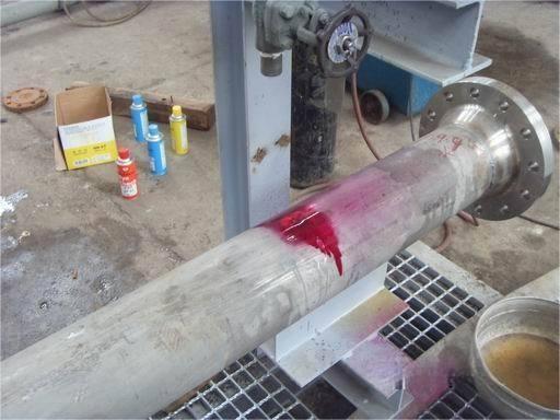 著色探傷的基本原理:用著色劑涂在材料的表面,著色劑滲入受損部位。放置一段時間后將表面的著色劑沖洗掉。在已經(jīng)清洗干凈的表面涂上顯影劑,損傷部位由于著色劑滲入其中從而看得一清二楚。 主要利用毛細(xì)現(xiàn)象使?jié)B透液滲入缺陷,經(jīng)清洗劑清洗使表面滲透液清除,而缺陷中的滲透液殘留,再利用顯像劑的毛細(xì)管作用吸附出缺陷中殘留的滲透液而達(dá)到檢驗(yàn)缺陷的目的。
